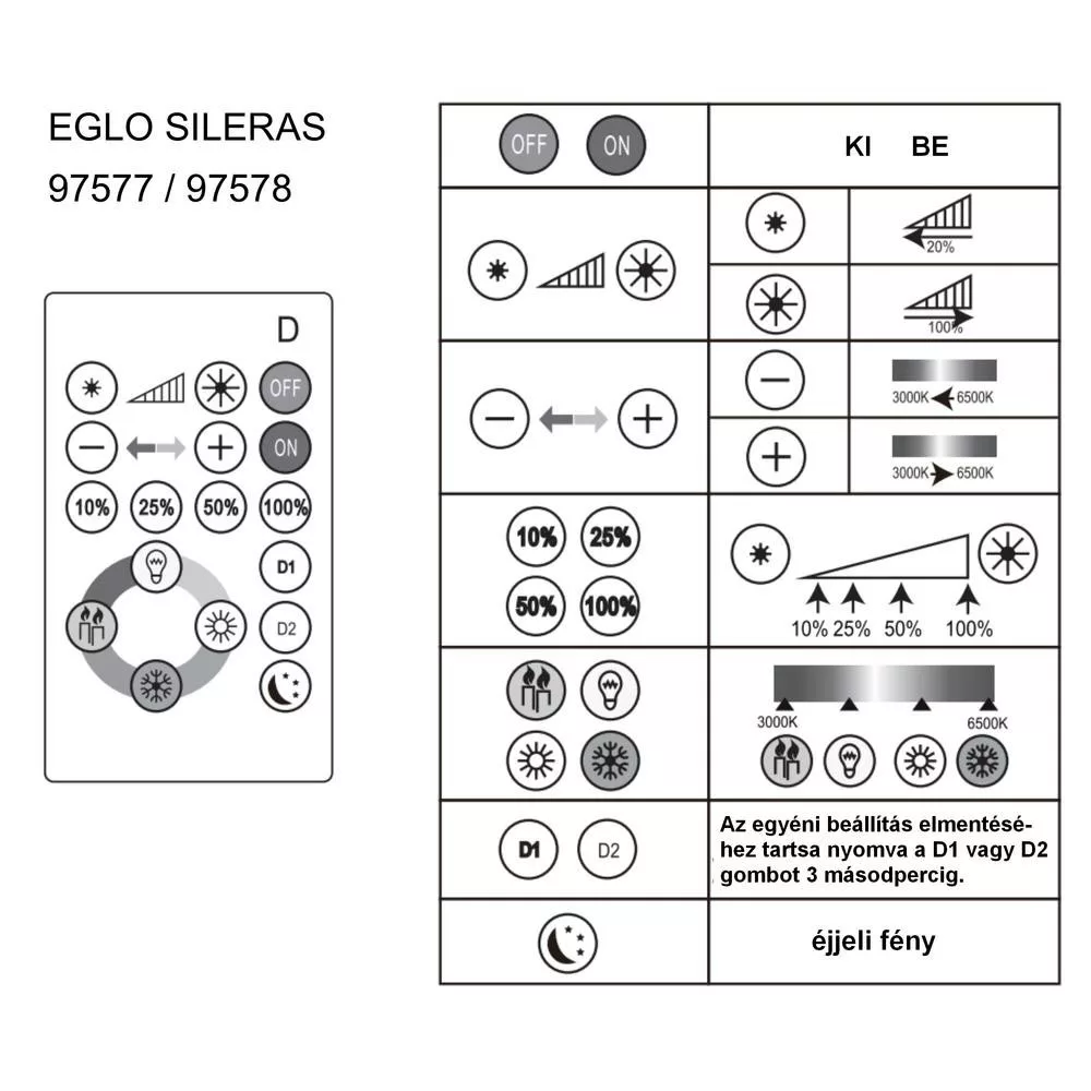 - 2 egyéni beállítás elmenthető (állítson be egyedileg fényt, majd a D1 vagy D2 gombot nyomja 3 másodpercig, ezáltal elmenti az adott beállítást)