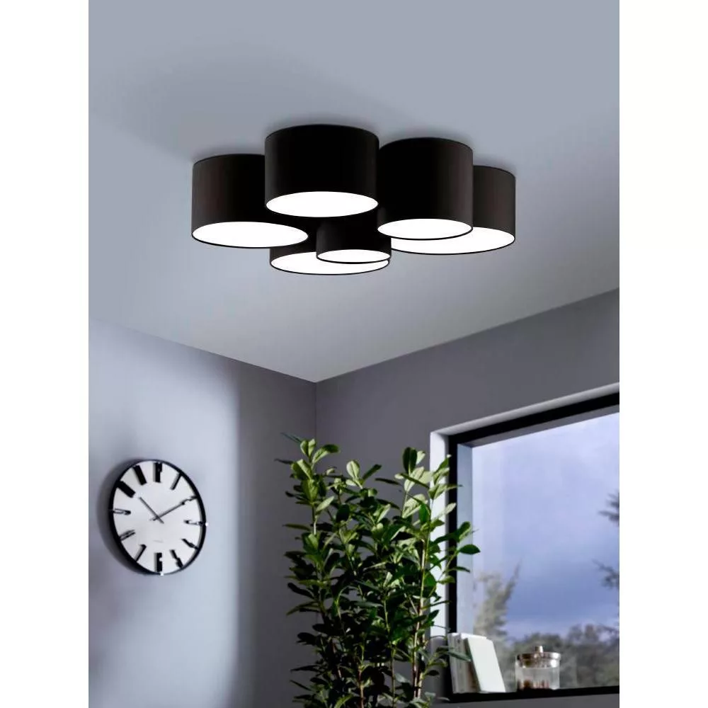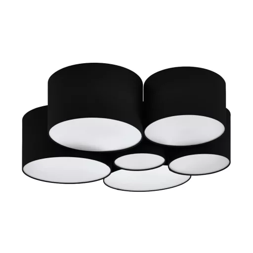 A PASTORE 2 mennyezeti lámpát 6 nagy, kerek fekete textil lámpaernyő alkotja. A fehér diffúzoroknak köszönhetően egyenletesen eloszlik a fény, és nem látszik a fényforrás. Az otthonos mennyezeti lámpa bármilyen stílushoz passzol, és kellemes hangulatot teremt otthonában. Házilag cserélhető, E27-es fényforrással működik: az Ön döntése, hogy milyen fényerejű, milyen színhőmérsékletű fényforrást vásárol hozzá.